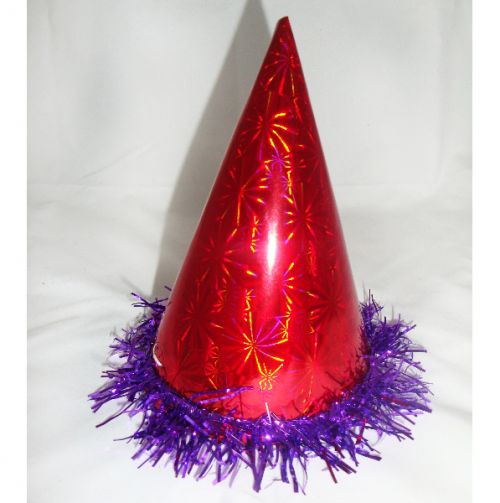 Колпачок праздничный фольга с дождиком 24см, цвета в ассортименте. Цвета: розовый, красный, зеленый, синий, золото, серебро.